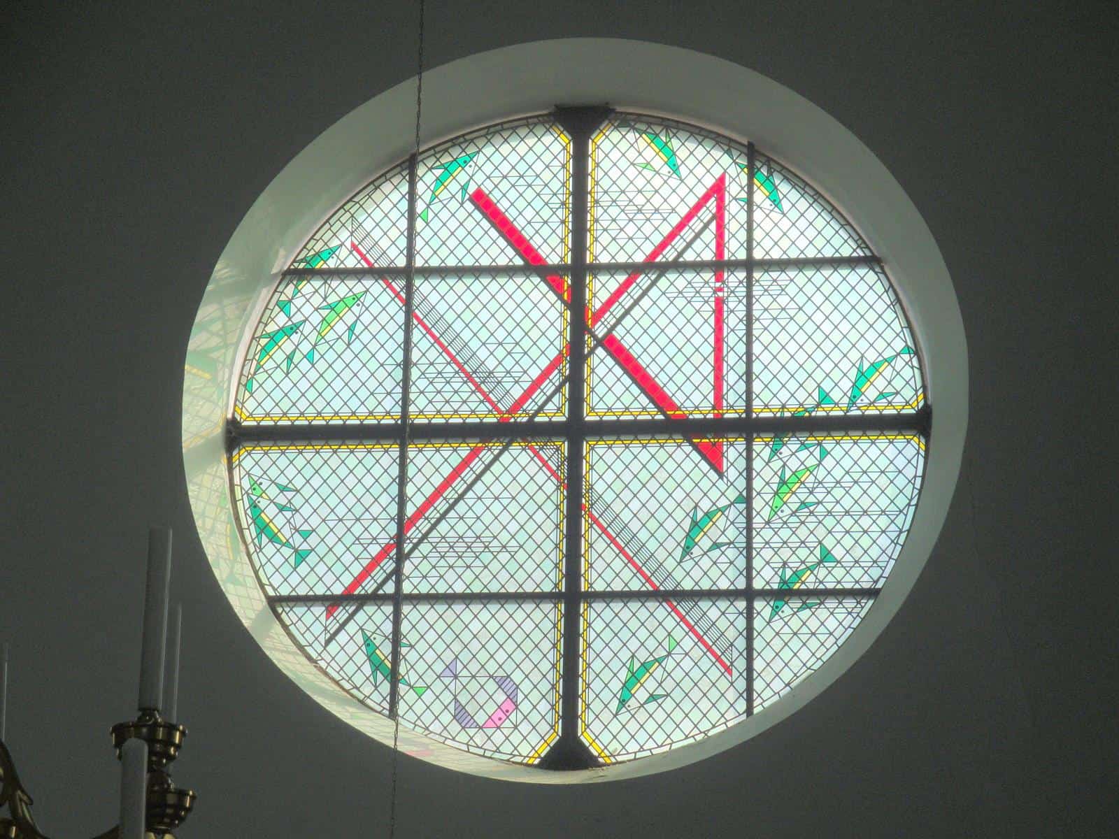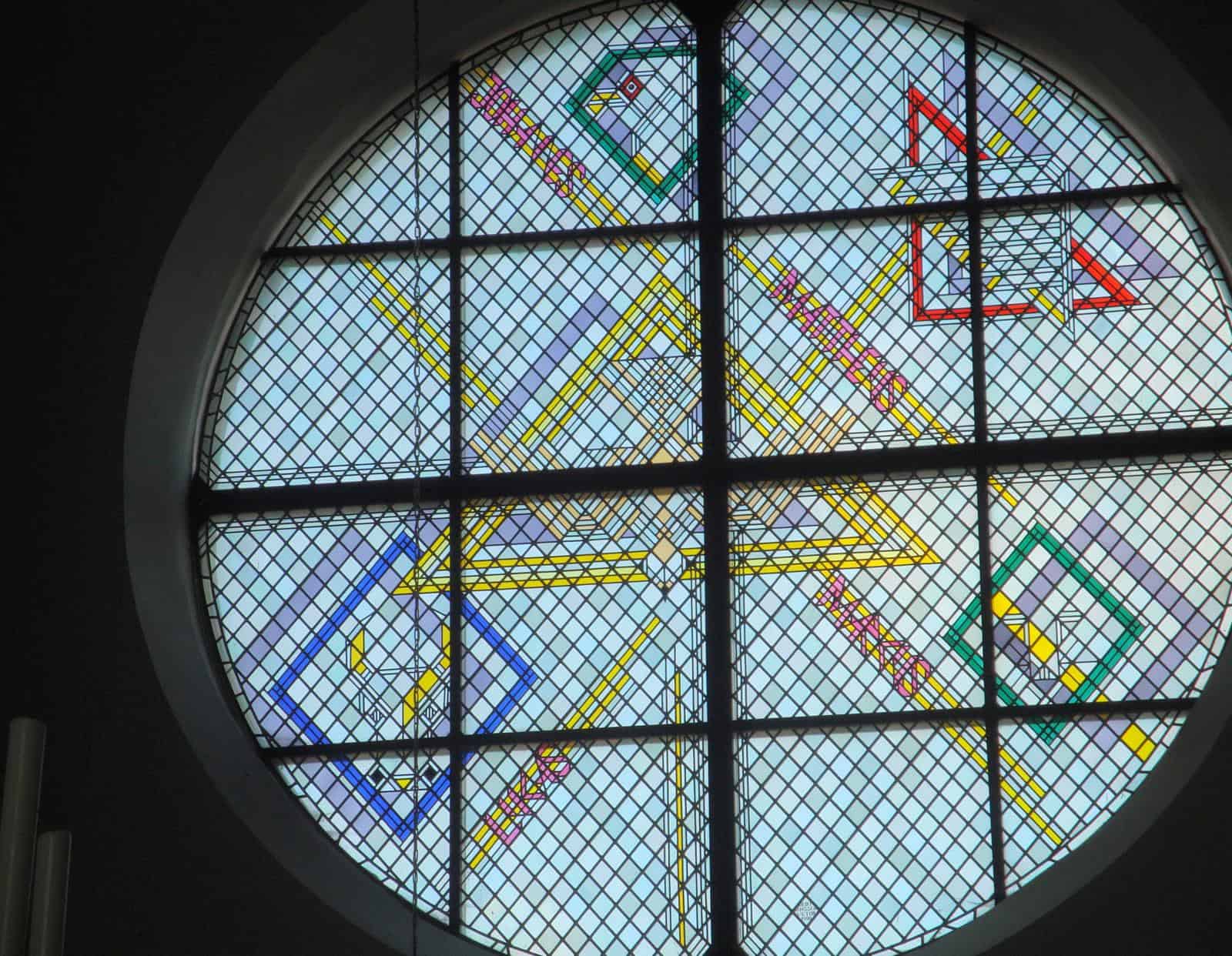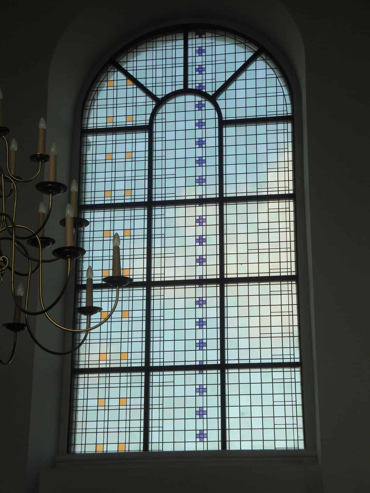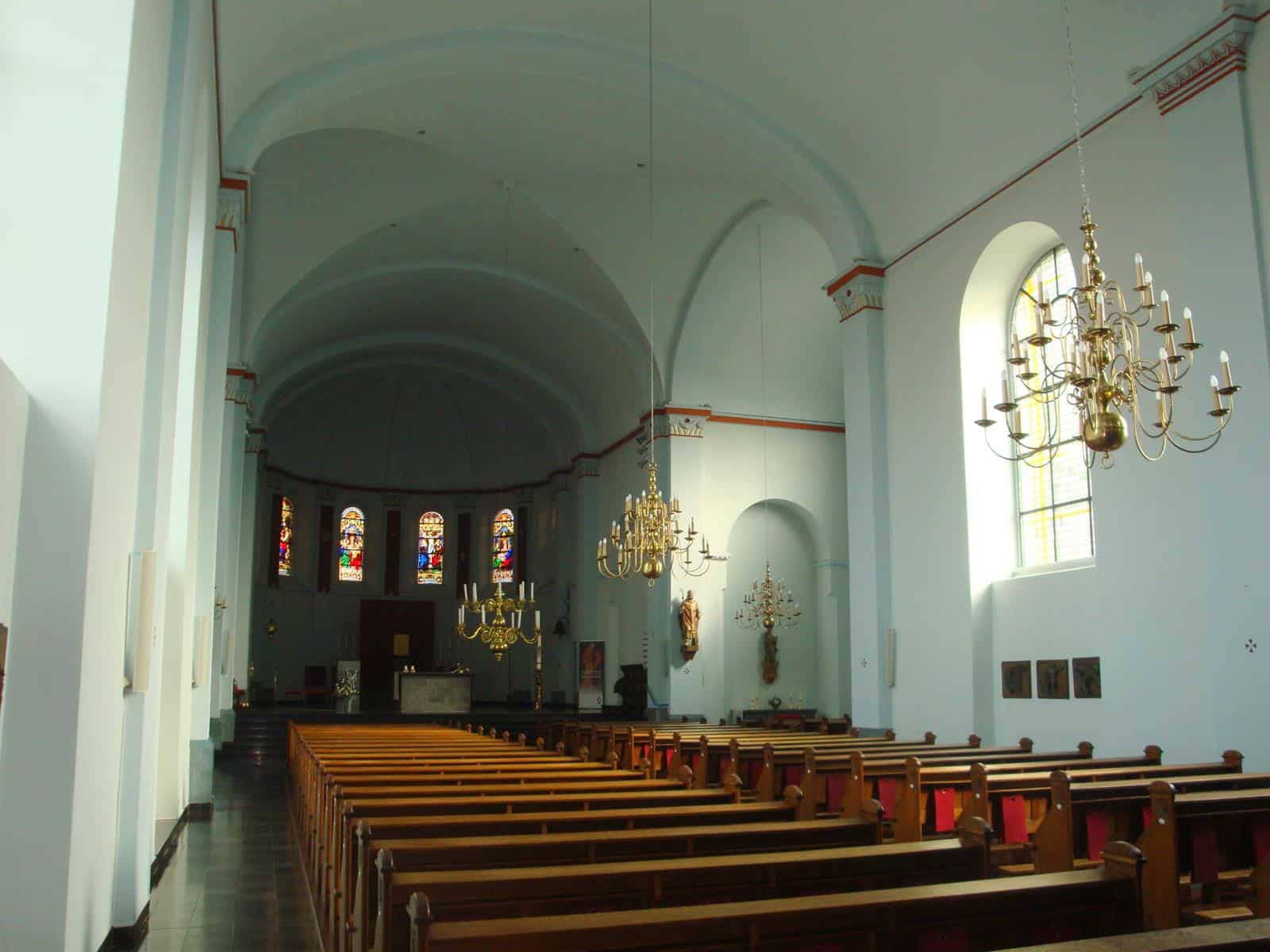 Met verve wist laatstgenoemde mij te vertellen hoe treurig de toestand van het gebouw voor de restauratie was. Monumentenzorg gaf geen cent voor dit gebouw: het plafond van stro en gips was bijna helemaal ingestort en de gegrisailleerde ramen (nog wel uit het atelier F. Nicolas en Zonen uit Roermond) uit het schip vielen bijna uit hun sponningen. De bevoegde instanties zagen geen noodzaak die te handhaven. In de apsis was de toestand iets beter. Toen kwam de pastoor op het idee contact op te nemen met de lichtkunstenaar Jan Dibbets. Die kreeg de gelegenheid om veertien ramen te ontwerpen: vier voor het schip, twee aan weerszijden van de zangerstribune, een drielichtvenster in de doopkapel en (als klap op de vuurpijl) twee grote ronde ramen in de twee transeptkoppen. Hij ontwerp ook nog vijf (niet uitgevoerde) koorramen. De ramen verbeelden een moderne spiritualiteit. Geen stripachtige taferelen waarin mensen bijbelse verhalen kunnen herkennen, maar symbolische decoraties die intrigeren en inspireren. In tegenstelling tot de latere ramen die Dibbets in de Haarlemse Bavo zou gaan maken hier geen aparte bijbelverhalen waar naar verwezen wordt, maar louter toveren met licht, kleuren en asymmetrische ‘grapjes’ om je op het verkeerde been te zetten. Wel zijn er in de doopkapel verwijzingen naar de vier paradijsstromen te vinden en kan de fantasierijke kijker allerlei bijbelse referenties aantreffen in de ronde transeptramen, die echter geen dwingende thematiek bevatten, maar ons suggereren dat God de Heer is van het licht, van de vissen die in de Geul rondspringen en die door de kruisdood van Zijn Zoon ons leven zin geeft tot op de huidige dag. Provincie, bisdom, Mondriaanstichting en parochianen leverden allemaal hun bijdrage. Dank daarvoor: wat kunnen we allemaal genieten, vooral als de zon met het licht speelt en ons doet beseffen dat alles toch goed is wat God heeft geschapen.