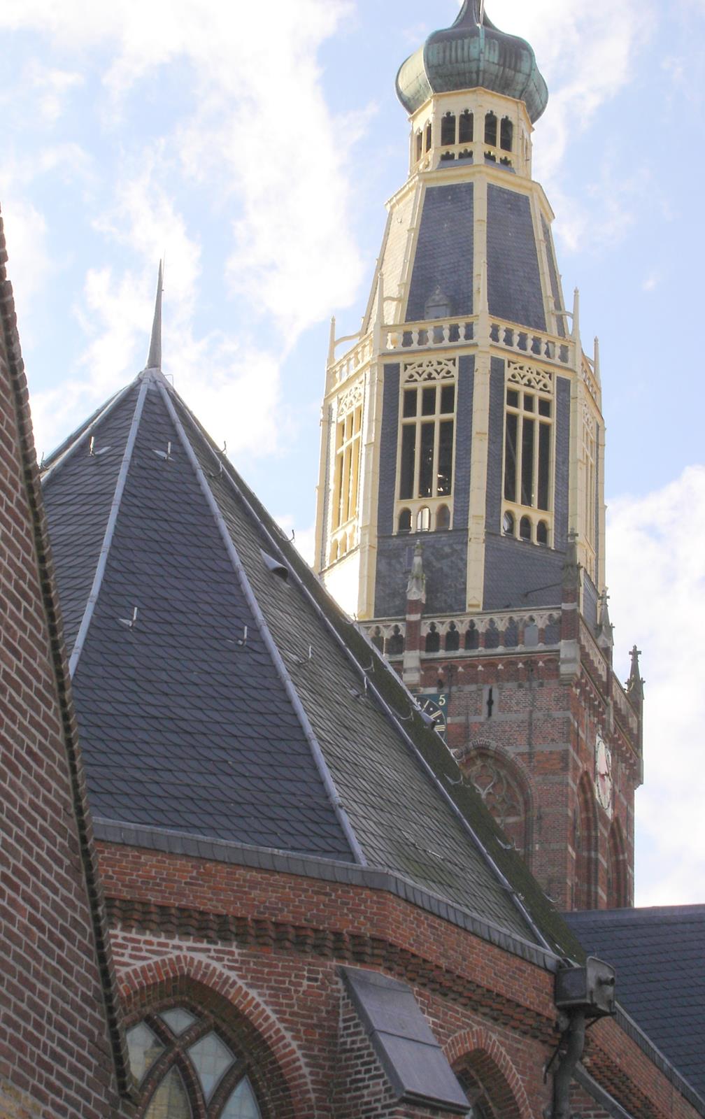 De een vervaarlijk breed (de Westerkerk aan St. Gommarus gewijd) en de andere lang en dun (de Zuiderkerk aan St.Pancratius gewijd). De eerstgenoemde heeft alleen maar een in 1519 gebouwd ‘klokhuis’, een klokkenstoel met een 19e eeuwse houten klassicistische hoes erom (wat oneerbiedig beschreven), de andere echter…. een geweldige toren, een baken voor de verre omtrek. De oude Pancratiuskerk was in de zee verdwenen en met de bouw van de ‘nieuwe’ werd in 1423 begonnen. De devotie tot een kruisvormige boom naast de kerk maakte uitbreiding van de kerk nodig: rond de boom werd een kapel gebouwd. En om de pelgrims de weg te wijzen moest de torenromp uit 1450 ook een stukje omhoog. In 1518 begon men daaraan en daarna plaatste men op het indrukwekkende stenen vierkant een hoge achtkantige bovenbouw à la de Dom van Utrecht. Bang dat het hele zaakje de Enkhuizense modder in zou zakken maakte men die maar van hout. Het geheel werd bekroond met een ‘toefje’, een open kroon. De kerk zelf is nu als hoofdkerk van de Hervormde gemeente (met oecumenische uitstraling!) in gebruik. Van binnen maakt de kerk een wat gedrongen indruk. Dat komt omdat de basementen van de zuilen door ophoging van de vloer niet meer zichtbaar zijn. De verhoging is echter niet genoeg om de schilderingen op het plafond goed te kunnen zien waar ik in dit artikeltje aandacht wil geven.
