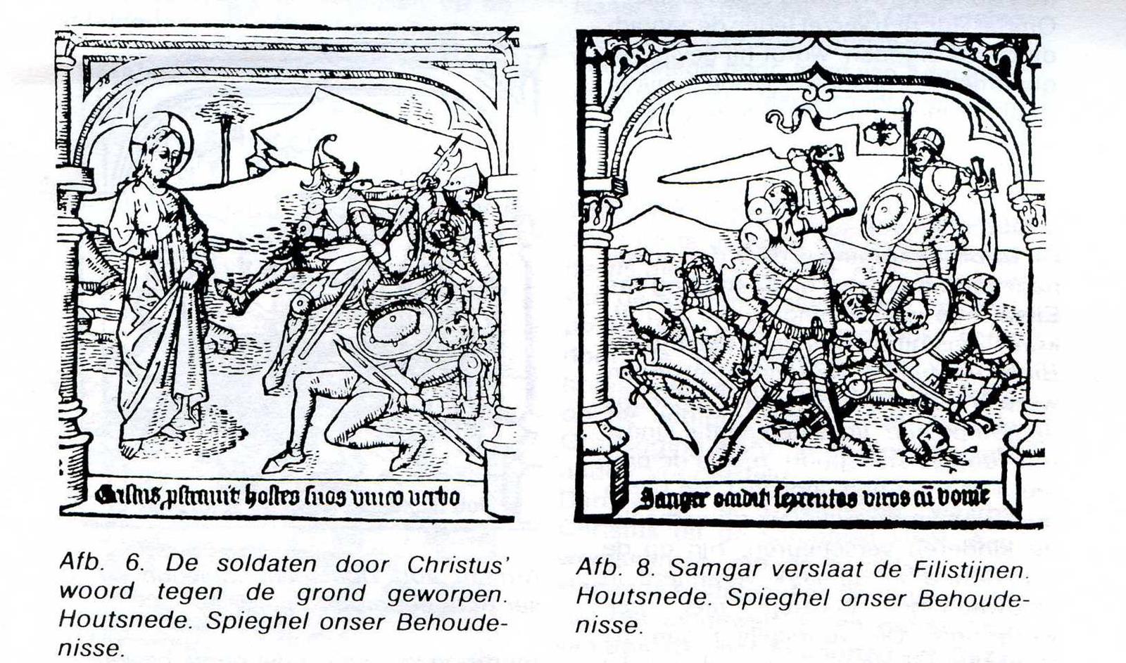 Enkele voorbeelden te zien op het plafond van Enkhuizen. Daar staan (net als op de bladzijden van de armenbijbels) naast elkaar: De drie Koningen en Davids drie helden (1 Kronieken 11), De Aankondiging aan Maria en Rebecca en Eliëser (Genesis 24), Jesus’ beproeving door de Satan in de woestijn en Davids strijd met Goliath (1 Samuël 17), de soldaten die ter aarde vallen in de hof van olijven en Samgar die de Filistijnen verslaat (Richteren 3,31) enz. De grote feesten staan ook afgebeeld: Kerstmis (gecombineerd met de droom van de hofschenker die de wijngaard ziet bloeien in Genesis 40,1-15), Palmzondag (met Davids Intocht in Jeruzalem 2 Kon.5,1), Goede Vrijdag (met de koperen slang uit Numeri 21), Pasen (met Simson die de poort van Gaza uit de hengsels tilt (Richt.16,3),  Hemelvaart (met de hemelvaart van Elia 2 Kon.2,11), Pinksteren (met de ontvangst van Mozes van de tien geboden (Exodus 31,18). Wat is de diepere betekenis van dit alles?