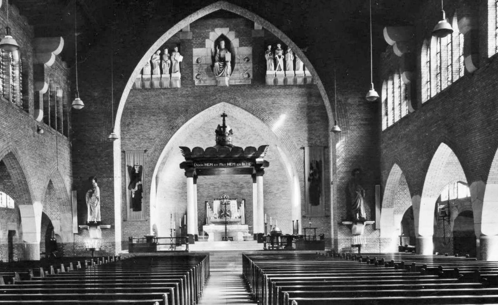 Kropholler leek voor de eeuwigheid te bouwen. ‘Leek’ zeg ik want soms bedot hij ons. Zeker de schroeven en moeren die in het zicht zijn, zijn echt. Maar zijn de balken wel zo dik? En die enorme steunberen aan de buitenkant? Antwoord: niet altijd. De balken zijn soms hol. Een stalen binnenwerk met een houten deklaag. Hetzelfde geldt voor de stenen beren. Dunne laagjes steen met daartussen niets. In een artikel over Kropholler in de Katholieke Illustratie van 1954 las ik, hoe B.Reith zich opwond over deze ‘verlakkerij’. Men verzekerde mij vanuit Amsterdam dat deze foefjes niet in de Martelaren zijn toegepast. Ik zou dat niet erg gevonden hebben, het ontroert mij juist dat sommige van Krophollers kerken niet zo bars en stevig blijken te zijn als ze lijken. Dat zie je maar aan die leuke pelikaan!