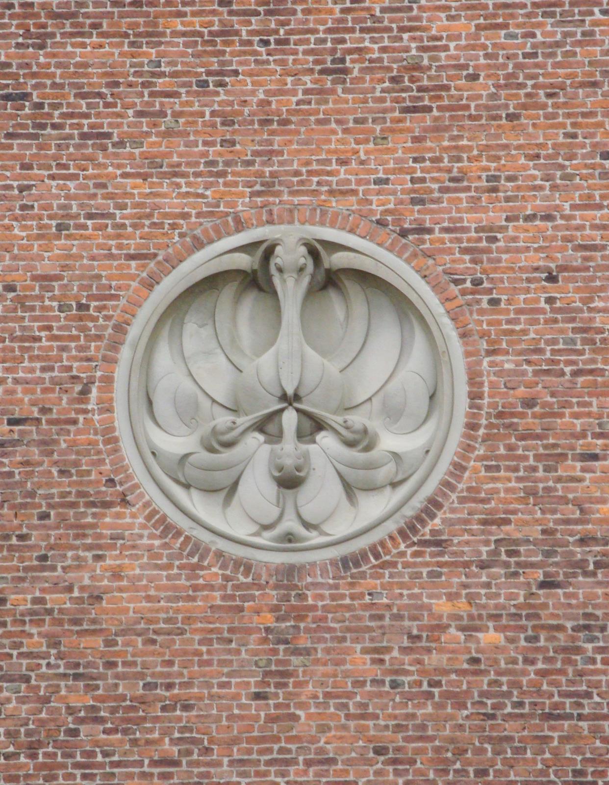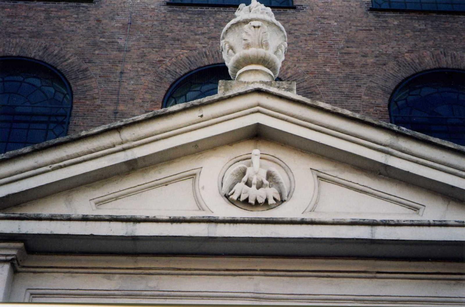 Toen ik de kerk op die genoemde operavond door de stevige deuren verliet viel mijn oog buiten op een bijzondere sculptuur in de toren links. In een rond medaillon prijkt een enorme pelikaan. Toch geen inheemse vogel in de Meer. Het blijkt een beeld te zijn van de joodse beeldhouwer Mendes da Costa. Vreemd, ik herinnerde mij die vogel eerder afgebeeld te zien in de buurt maar waar? Plots wist ik het.