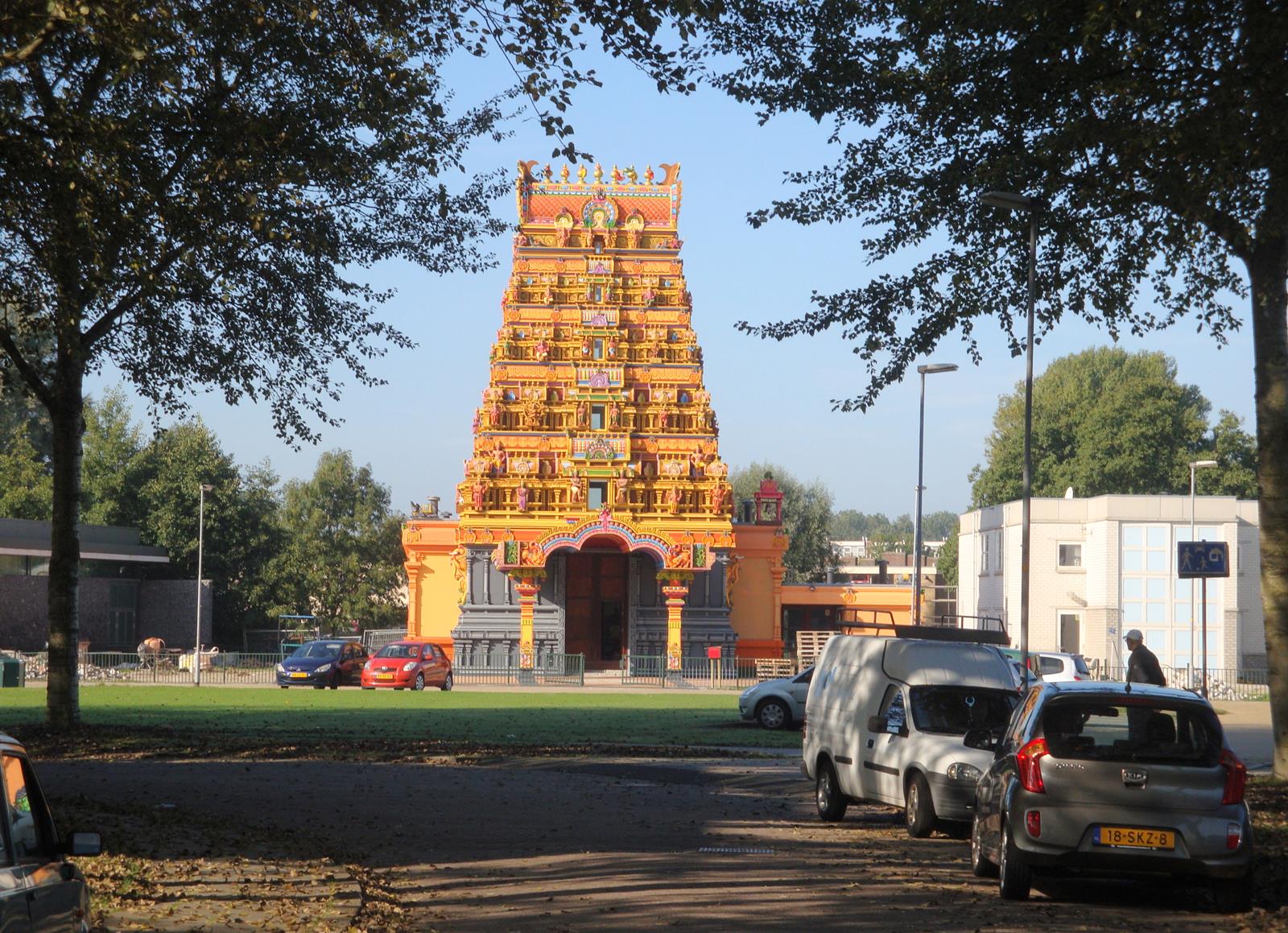 Wie Den Helder langs de vliegbasis binnenrijdt komt in een charmante woon­wijk terecht. Daar ligt de Annie Romein-Verschoorlaan, door de Helderaars ‘reliboulevard’ genoemd omdat hier verscheidene kerkgenootschappen neerstreken. Verbijsterend echter is de ervaring als plots aan den einder een bontgekleurde tempeltoren verschijnt. Het is het Raja Gopuram-gebouw, luisterrijk ingewijd op Prinsjesdag 2013, een ritueel dat vele dagen in beslag nam. In de plaatselijke pers las ik dat er in Nederland zo’n 250.00 hindoes wonen. Vaak zijn ze van Surinaamse afkomst of komen ze uit landen als Sri Lanka en India. Den Helder lijkt niet centraal gelegen, maar dat hindert niet. Ook in veel andere steden houden hindoes hun vieringen. Een officiële tempel is daarvoor niet eens vereist. Waarom dan toch deze bijzondere tempel in Den Helder? “Dat is toeval…”, zegt Mano Manoraahavan van de hindoegemeenschap in Den Helder. “We zijn hier in 1991 ooit heel klein begonnen. Eerst in een oude kerk en later een schoolgebouw. Van daaruit zijn we doorgegroeid. In 2003 zijn we met de laagbouw van de tempel begonnen en nu is de toren klaar.’ Komen en wel mensen hier? ‘ Mensen komen uit het hele land bij ons, tot uit Roermond aan toe. De tempel staat bewust in een woonwijk. Dat moet, volgens het hindoeïsme. De goden beschermen alle mensen die om de tempel wonen.”