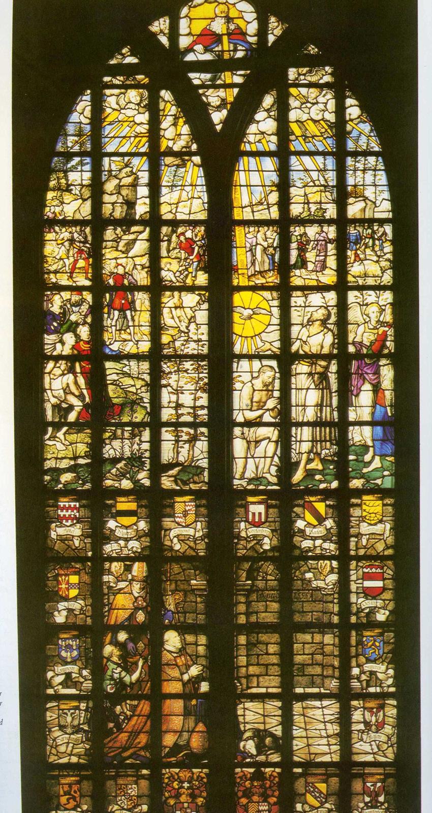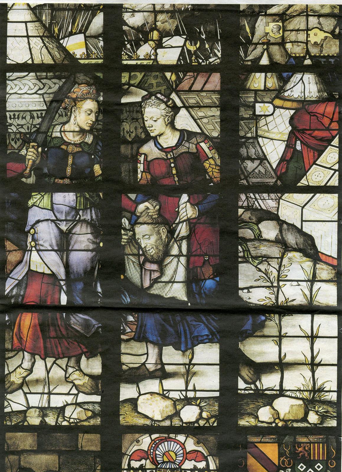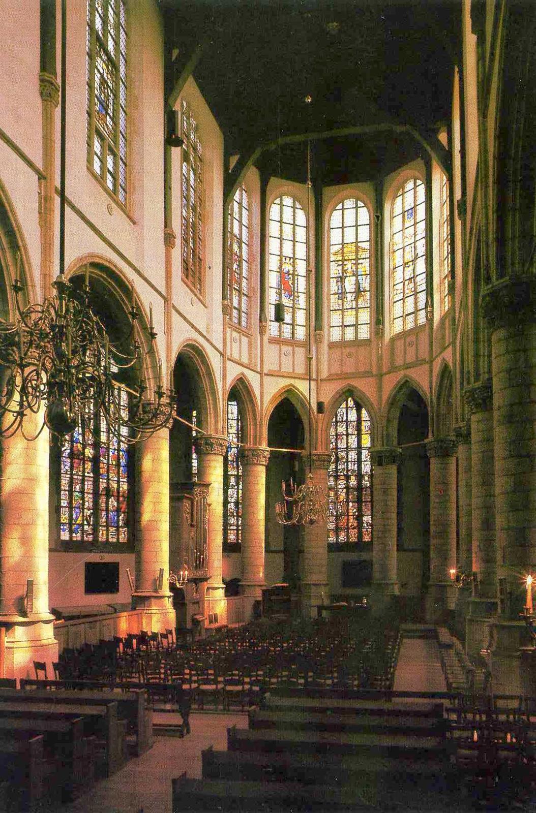 We gaan kijken in het Zuid Hollandse Gouda. Daar werd een aan Sint Jan toegewijde kerk gebouwd mogelijk nog voor 1272 toen Floris V het plaatsje stadsrechten verleende. Meerdere branden hadden steeds nieuwe kerkbouwprojecten tot gevolg. Maar elk nadeel heeft zijn voordeel. Na de brand van 1552 ging men groots aan het werk. Inzamelingen in bevriende steden leverden genoeg geld op en hoewel de kerk wat van zijn gotische luister verloor (er werden zuilen weggebroken) werd er een unieke beglazing aangebracht waarbij Dirck Crabeth, (1505-1574), leerling van Jan van Scorel en Maarten van Heemskerk een opvallende rol bij speelde samen met broer Wouter en enkele anderen. Maar er gebeurde iets wonderlijks. Terwijl men nog bezig was met de beglazing veranderde de kerk van gebruiker! In 1573 werd de kerk toegewezen aan de protestanten. Altaarstukken werden verwijderd, sommigen bevinden zich in het naast de kerk gelegen museum maar de glazen werden ongemoeid gelaten. Ja men voegde na een korte onderbreking zelfs nieuwe ramen toe. In de katholieke tijd waren er krachtige Bijbelse thema’s. Ramen over de bouw en de inwijding van de tempel van Jeruzalem (verwijzing naar het Goudse bouwproject). Men ziet hoe die tempel eerbiedig wordt bezocht door de koningin van Scheba maar minder eerbiedig door Heliodorus (II Makkabeeën 3) de rover. De hogepriester bidt en er verschijnt een paard dat de onverlaat de tempel uittrapt. Dit laatste raam is uit 1566 gegeven door de hertog van Brunswijk ‘uit ijver voor de katholieke godsdienst.’ Zag men de bui van de beeldenstorm al hangen? Gelukkig viel die mee.