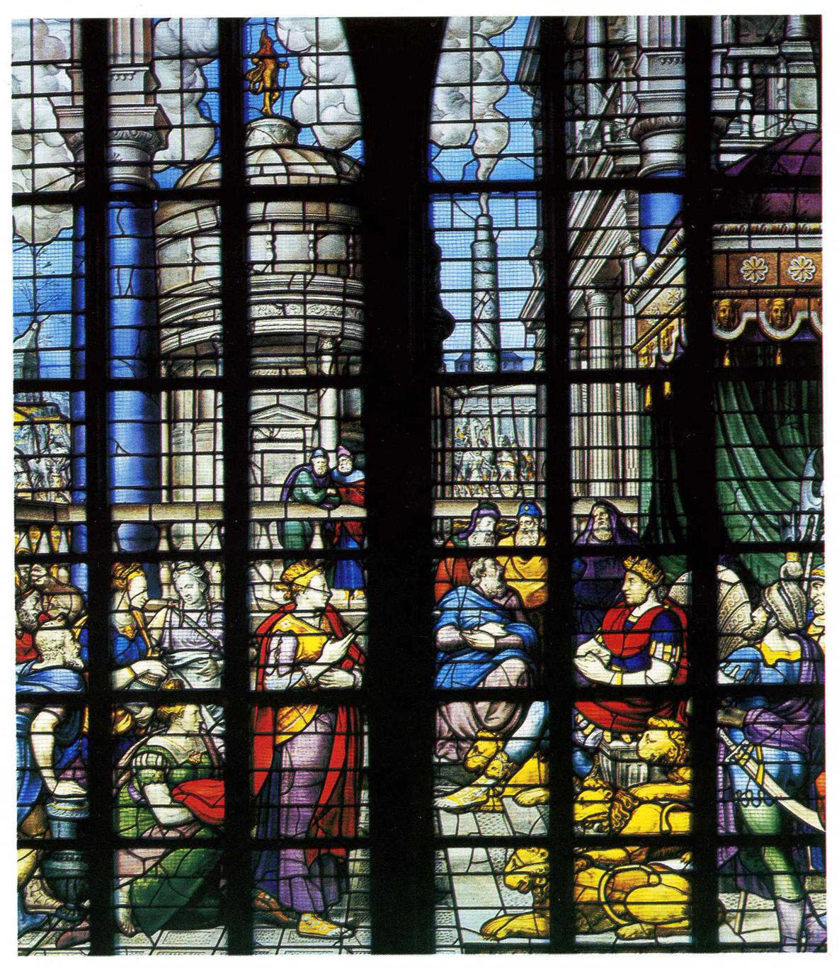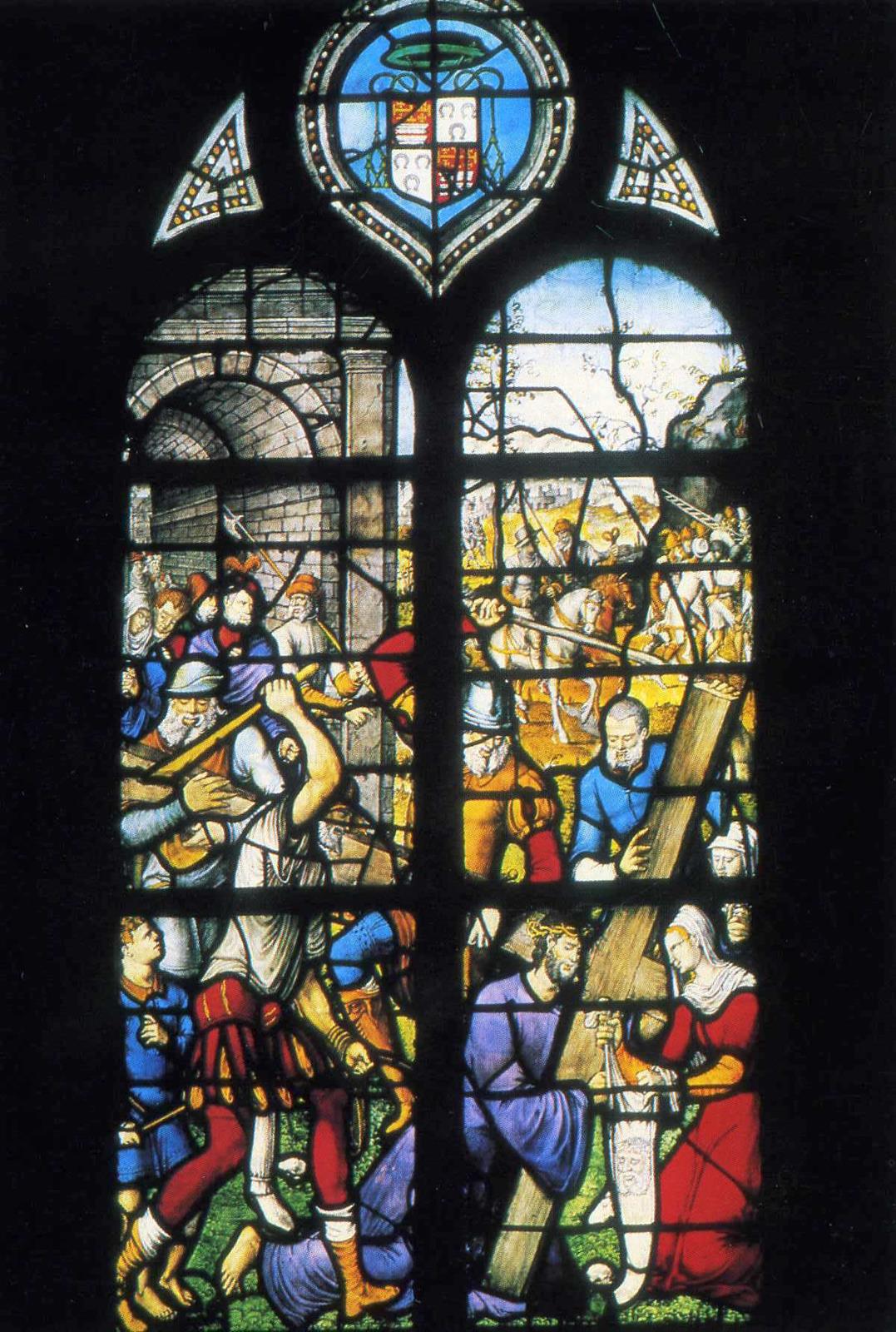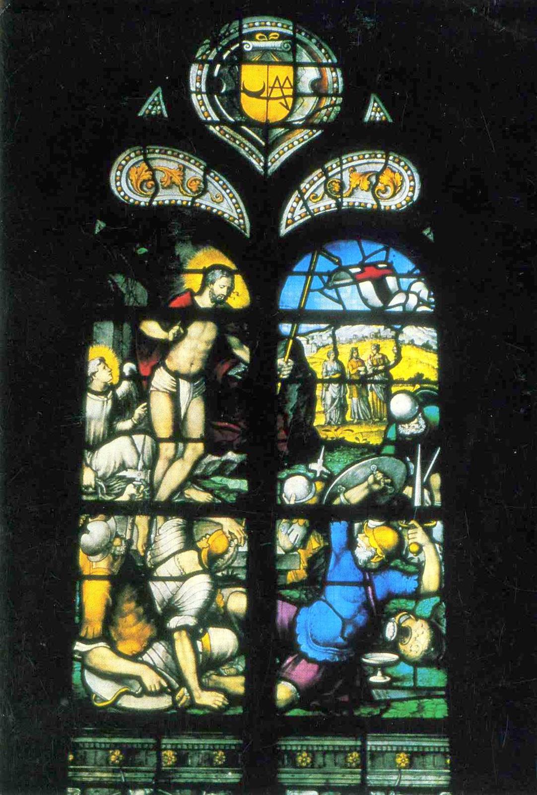 We gaan kijken in het Zuid Hollandse Gouda. Daar werd een aan Sint Jan toegewijde kerk gebouwd mogelijk nog voor 1272 toen Floris V het plaatsje stadsrechten verleende. Meerdere branden hadden steeds nieuwe kerkbouwprojecten tot gevolg. Maar elk nadeel heeft zijn voordeel. Na de brand van 1552 ging men groots aan het werk. Inzamelingen in bevriende steden leverden genoeg geld op en hoewel de kerk wat van zijn gotische luister verloor (er werden zuilen weggebroken) werd er een unieke beglazing aangebracht waarbij Dirck Crabeth, (1505-1574), leerling van Jan van Scorel en Maarten van Heemskerk een opvallende rol bij speelde samen met broer Wouter en enkele anderen. Maar er gebeurde iets wonderlijks. Terwijl men nog bezig was met de beglazing veranderde de kerk van gebruiker! In 1573 werd de kerk toegewezen aan de protestanten. Altaarstukken werden verwijderd, sommigen bevinden zich in het naast de kerk gelegen museum maar de glazen werden ongemoeid gelaten. Ja men voegde na een korte onderbreking zelfs nieuwe ramen toe. In de katholieke tijd waren er krachtige Bijbelse thema’s. Ramen over de bouw en de inwijding van de tempel van Jeruzalem (verwijzing naar het Goudse bouwproject). Men ziet hoe die tempel eerbiedig wordt bezocht door de koningin van Scheba maar minder eerbiedig door Heliodorus (II Makkabeeën 3) de rover. De hogepriester bidt en er verschijnt een paard dat de onverlaat de tempel uittrapt. Dit laatste raam is uit 1566 gegeven door de hertog van Brunswijk ‘uit ijver voor de katholieke godsdienst.’ Zag men de bui van de beeldenstorm al hangen? Gelukkig viel die mee.