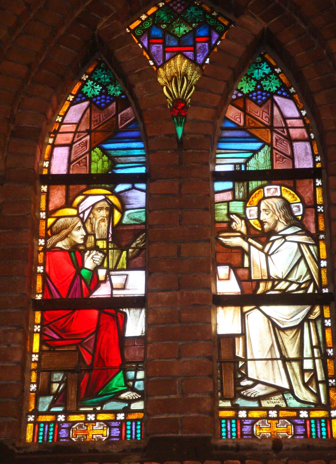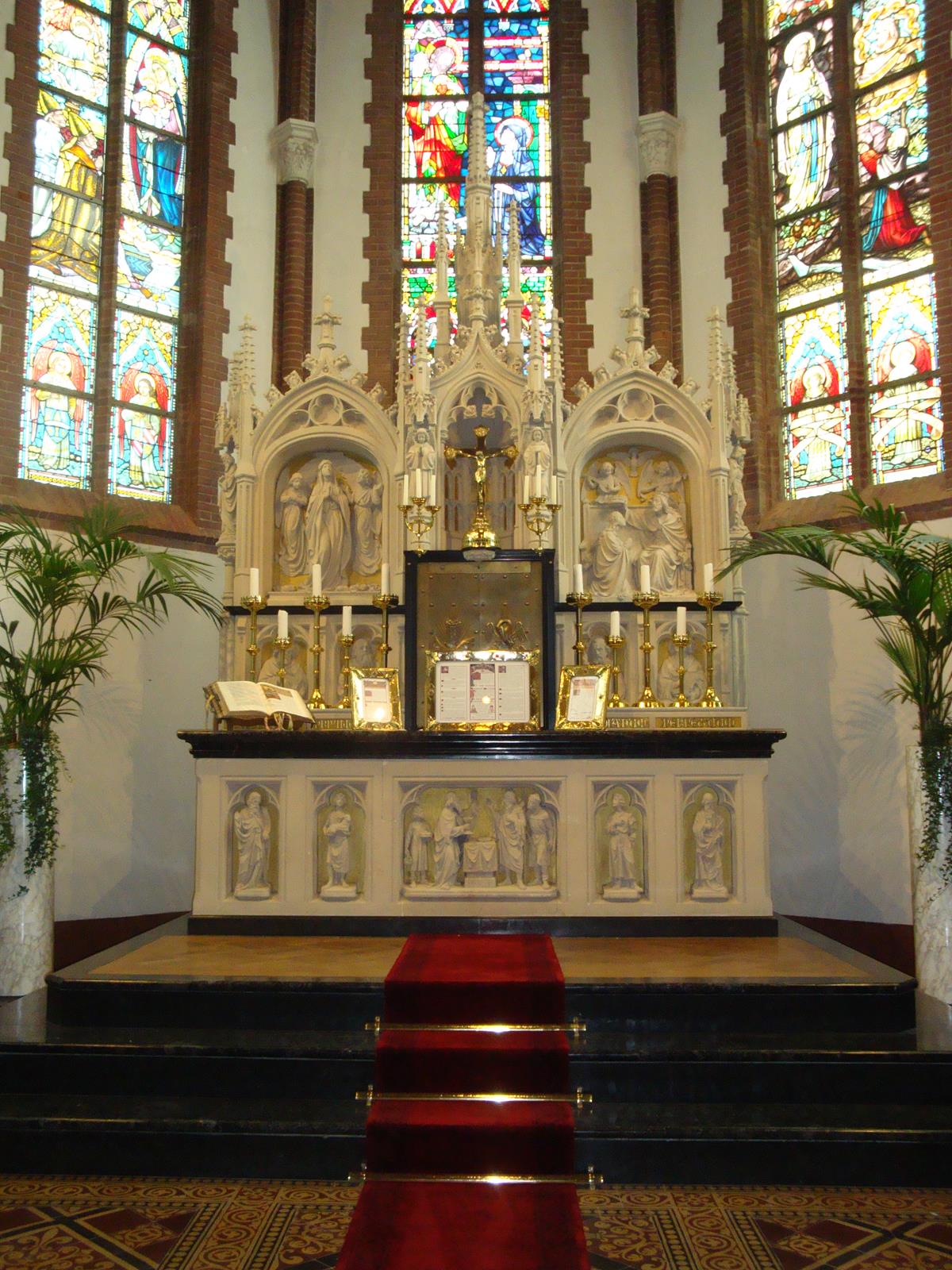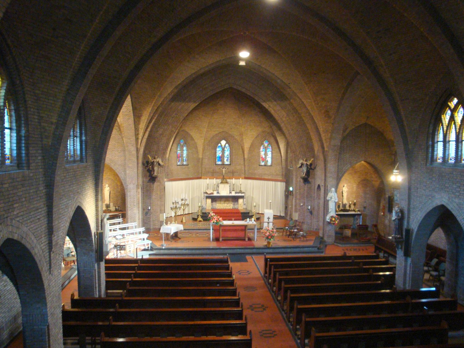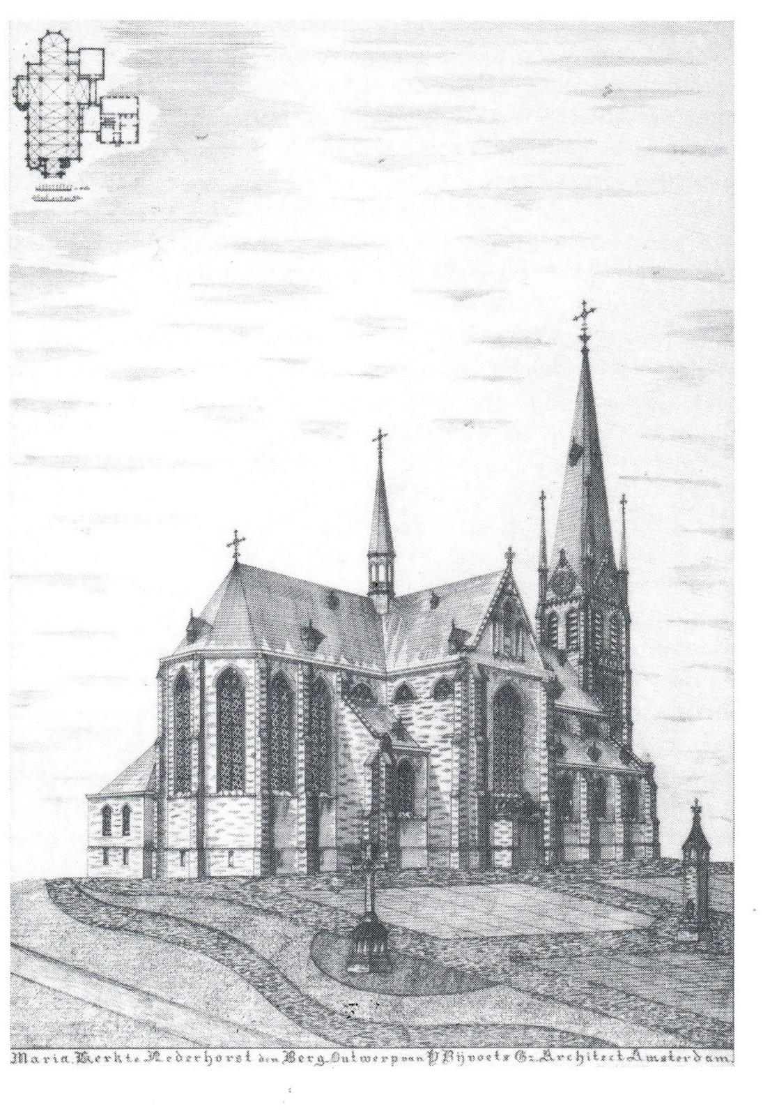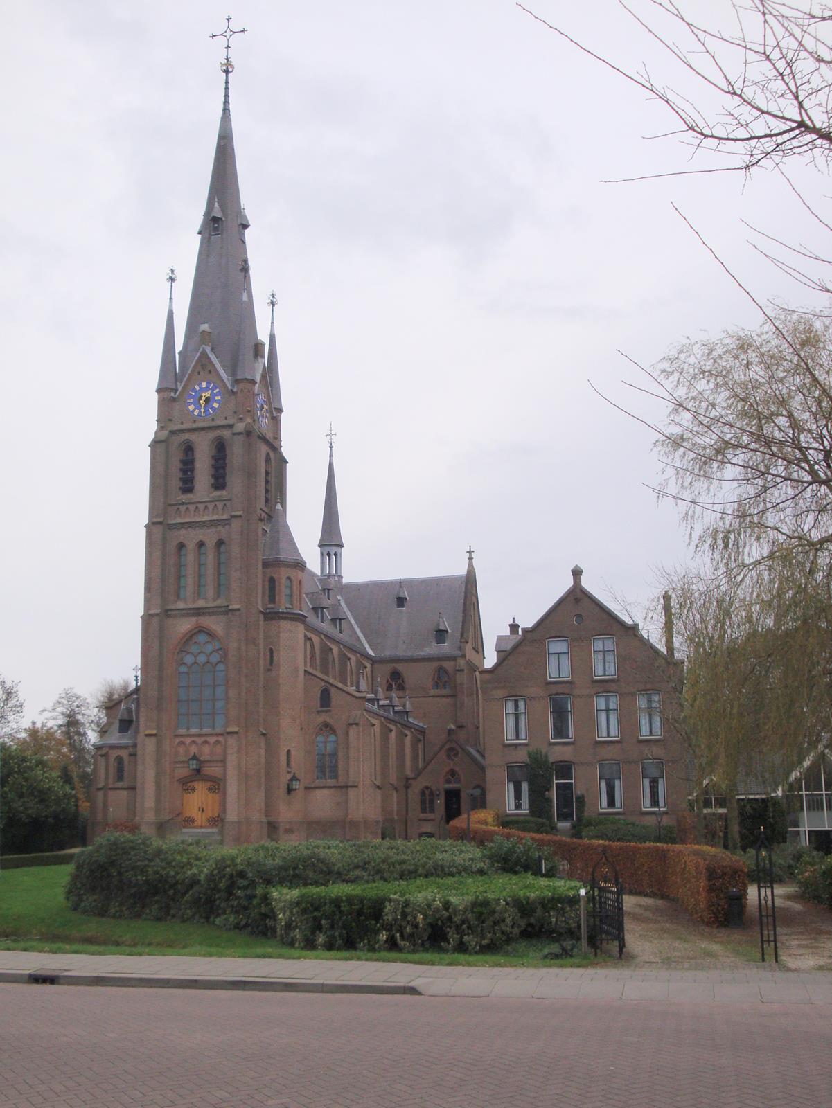 De Nederhorster parochianen werden het naar Ankeveen trekken moe en in 1811 bouwden ze een eigen schuurkerkje. Toen dat in 1888 te krap bleek werd dat gesloopt. Een nieuwe grote kerk werd door architect Y. Bijvoets gebouwd. Die werd (helaas ?) niet aan de plaatselijke patroon Willibrord gewijd maar aan Onze Lieve Vrouw Hemelvaart. Ik heb moeite met die titel: Maria is toch ‘ten hemel opgenomen’? De kerk is wel indrukwekkend. De toren heeft maar liefst vier geledingen met frontalen en hoekpinakels (die bij de meeste neogotische kerken verdwenen zijn). Voor veel watersporters hier is hij een duidelijk baken. In de grote kerkenbijbel (het standaardwerk ‘Katholieke Kerken in Nederland’ van Cuypers en Kalf uit 1906) staat wel een beetje hatelijke opmerking: ‘men heeft een tamelijk kleine kerk waar men niet al te veel geld voor over had toch alles gegeven wat het op een grote kerk moet doen lijken.’ Kennelijk zijn de druiven voor Cuypers zuur. Toch is er niet zuinig gehandeld. De kerk heeft een mooie inventaris. Een communiebank uit 1866, een Mariaaltaar uit 1902. Kruiswegstaties van K. Dunselman (1902-1908) en een door J. Matthijs vervaardigd zandstenen hoofdaltaar (1911), naar ontwerp van de architect Bijvoets zelf. Er is ook een fraai Maarschalkerweerdorgel uit 1906. In 1987 werd de kerk tot Nationaal Monument verklaard. In september 2015 is het 125-jarig jubileum van de kerk gevierd met een tentoonstelling en allerlei leuke activiteiten.