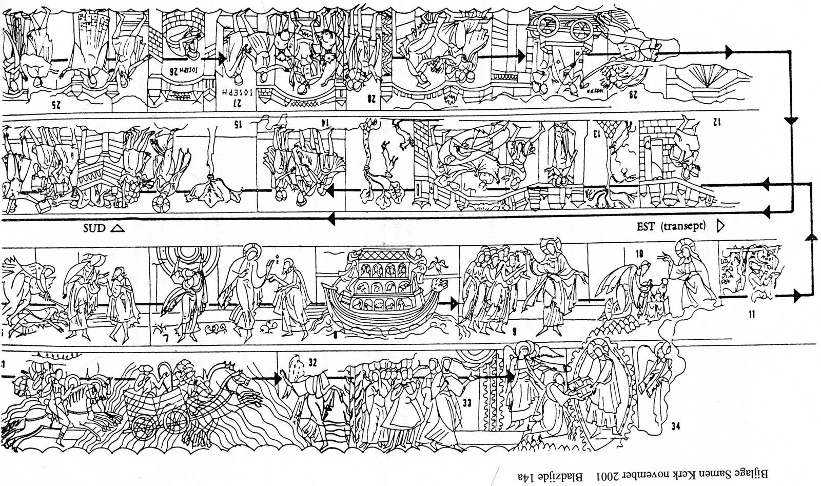 ‘Haarlem, stad van de strips’. Zo adverteert men in onze stad regelmatig. Vandaag een andere strip: uit 1050 in S.Savin sur Gartempe (oostelijk van Poitiers). Saint Savin sur Gartempe… een dorpje in de Poitou. ‘Gartempe’ is de welluidende naam van het riviertje dat langs Saint Savin stroomt. Een ongelooflijk hoge torenspits trekt van verre de aandacht van de pelgrim/toerist. Gewapend met hun Guide Michelin stevenen zij energiek op de kerk af.