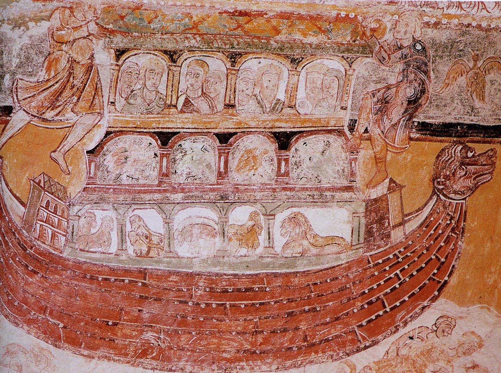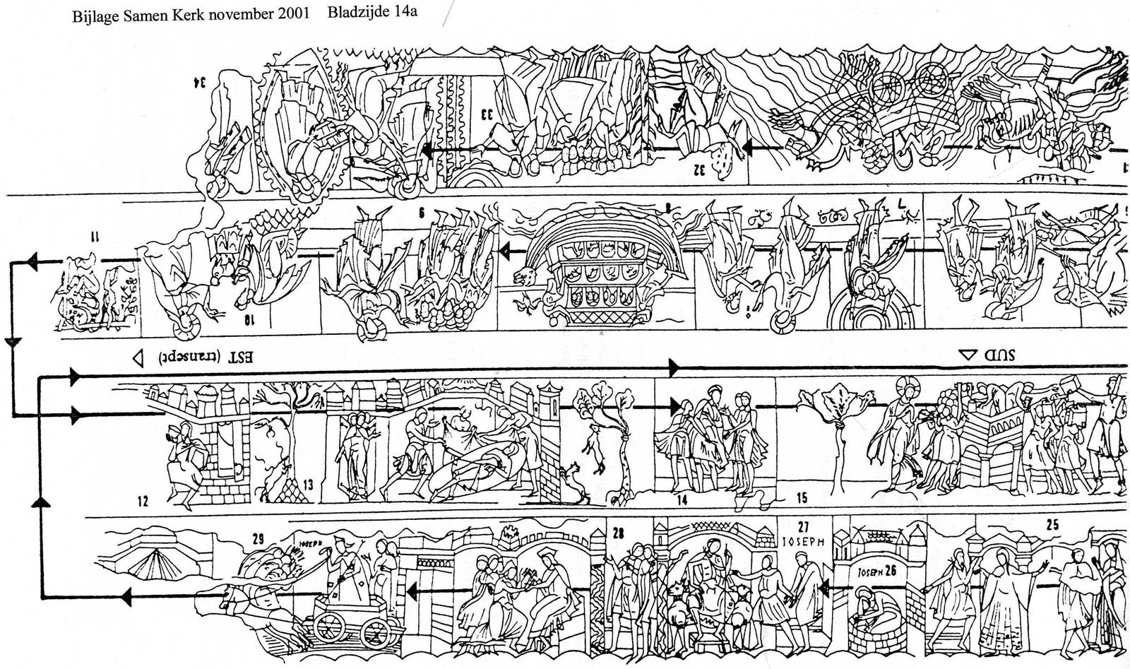 En die gids is nodig want binnen in de Abdijkerk is een zeer bijzondere reeks fresco’s te vinden op het vijftig meter lange plafond. Enigszins verbleekt maar nog zeer kleurrijk kijken Adam en Eva, Noach, Abraham, Mozes, Jozef ons aan. Eén figuur valt een beetje uit de toon, hij steekt met zijn hoofd buiten de fresco’s uit. Het is God zelf die buiten de gewone proporties valt, maar toch met onze vaderen (en moeders), gewone stervelingen, in gesprek ging (zie 7 en 9 God zegent Noach voor en na de zondvloed, 34 de Sinaï). De hele heilsgeschiedenis staat op het plafond: Noach (zie nr.7-14). Domme mensen bouwen Babel (15). Gelukkig roept God Abraham en begeleidt hij later het hele volk (nr.33) om op weg te gaan en geeft Hij hun zijn wet als richtsnoer ( 34). De Jozefgeschiedenis (25-29) herinnert ons eraan dat het niet meevalt om geroepen te zijn en Joseph in de put (nr.26) verwijst naar Jesus in het graf. De pelgrims hebben al sinds 1050 naar deze fresco’s kunnen kijken. En naar zoveel andere ‘vrome stripverhalen.’